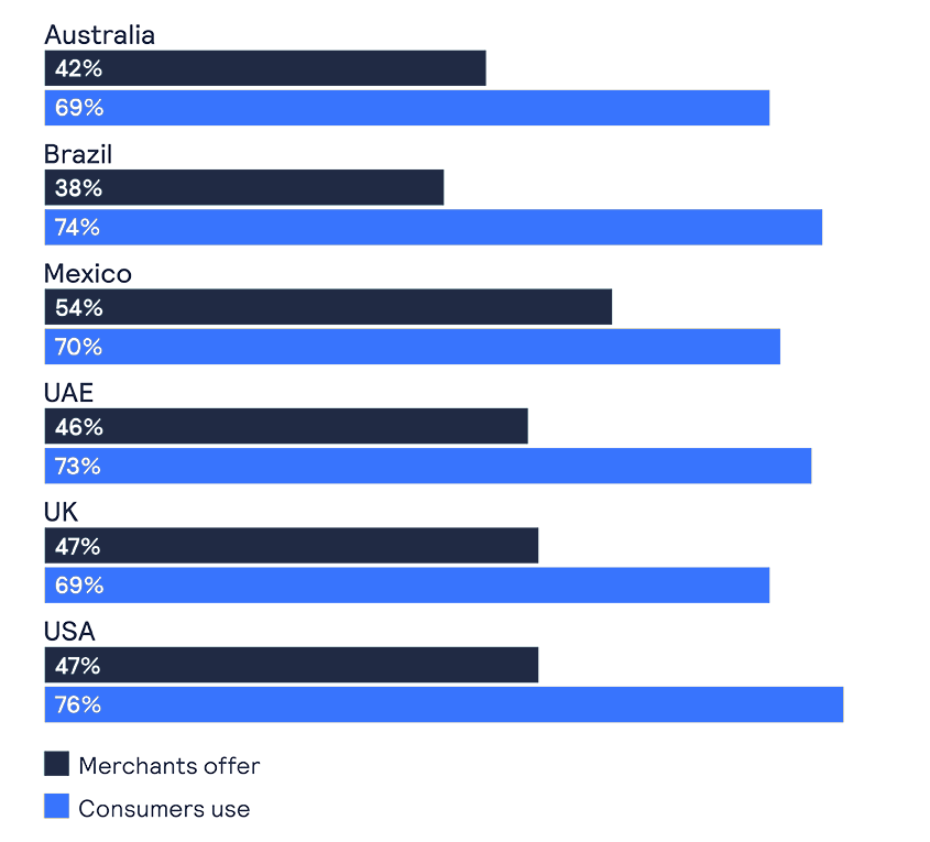 This disconnect between how consumers want to pay and what merchants offer varies between the countries we surveyed. While in all territories consumers were underserved in terms of preferred payment options, the gap was largest in Brazil, and smallest in Mexico.